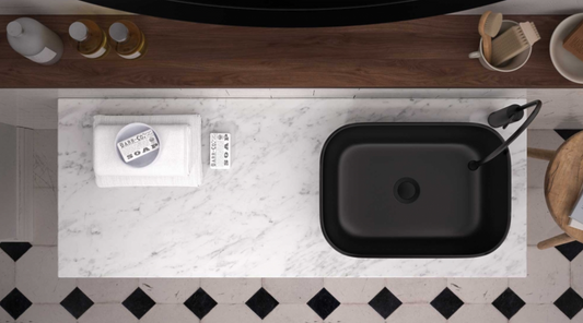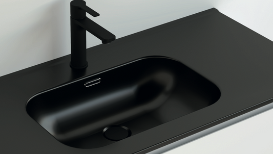 Black ceramic countertop with integrated Planet sink for bathroom furniture by Maderó Atelier