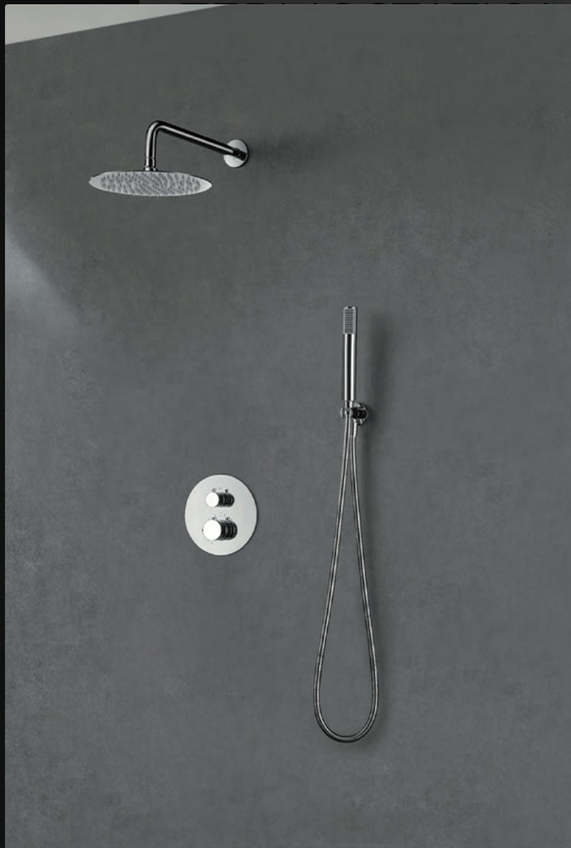 Stainless steel sprinkler. S.304 Ø25 cm, extra flat, chrome and anti-lime finish. Chrome finish brass wall outlet tube.