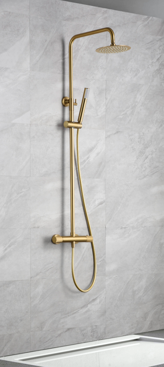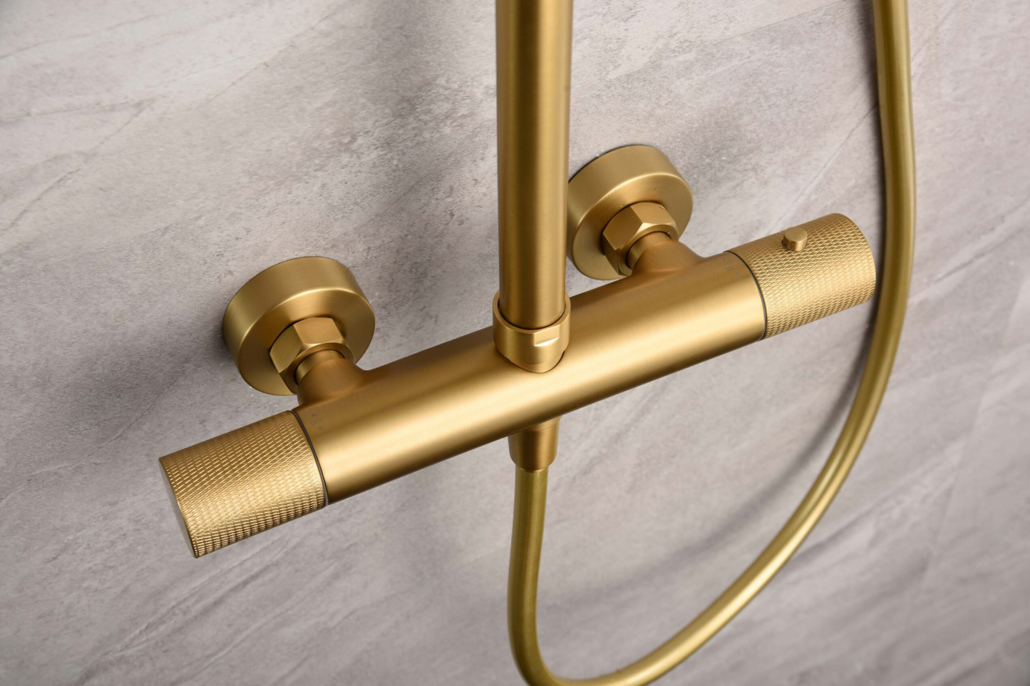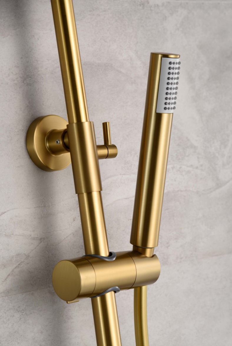 Stainless steel shower bar. S.304 extendable brushed gold finish. Stainless steel sprinkler. S.304 Ø20 cm, extra flat, brushed gold and anti-lime finish.