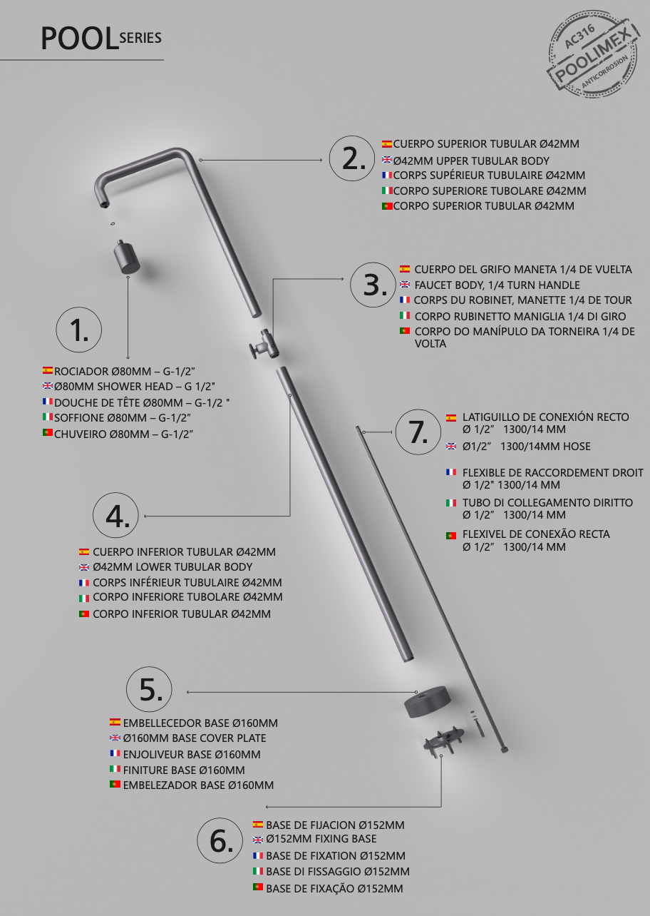 EXTERNAL MONOFLUID SHOWER IN STAINLESS STEEL S.316 POOL SERIES