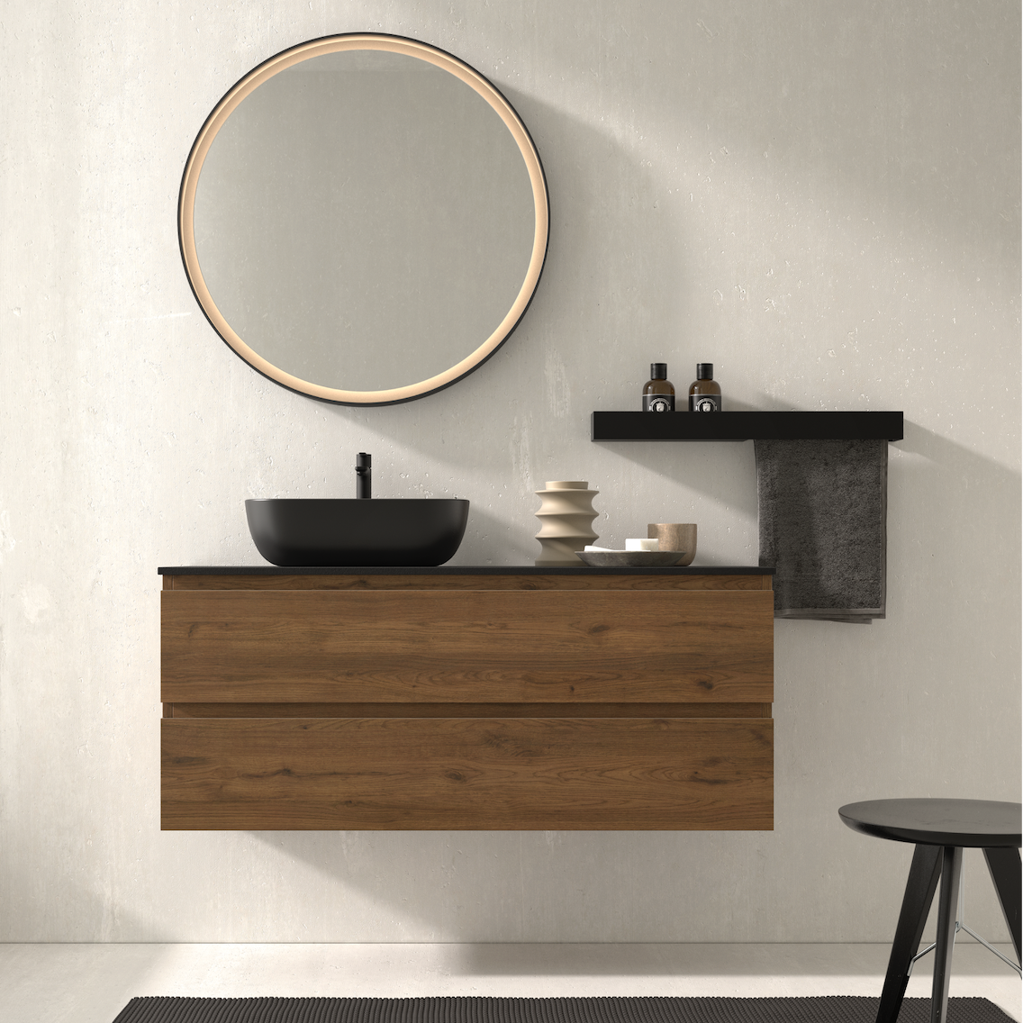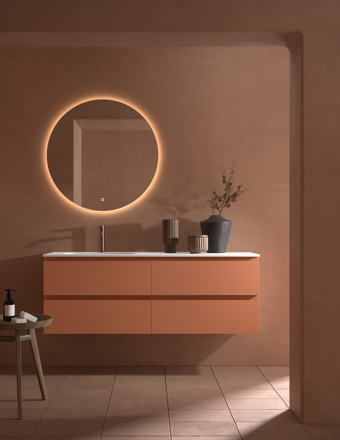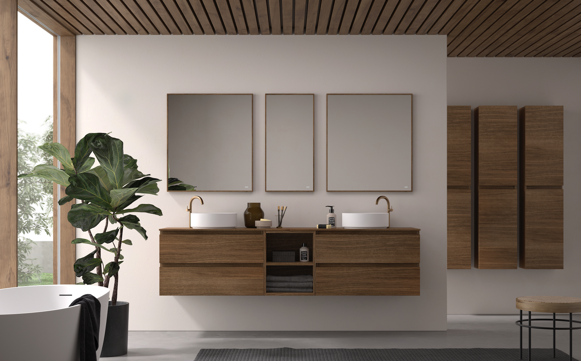45-degree mitered fronts, natural stained wood veneer interiors, and a robust and distinctive solid wood dispenser in the first drawer of the vanity units make the Leo collection a unique modular program.