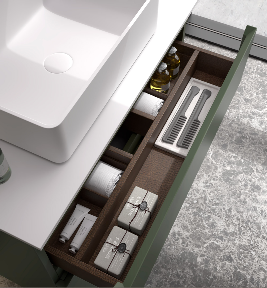 4.7 cm high dividers are supplied as standard for the first drawer of vanity units measuring 80 cm or larger. (One divider is supplied per vanity unit.) Its five formats fit different furniture sizes.