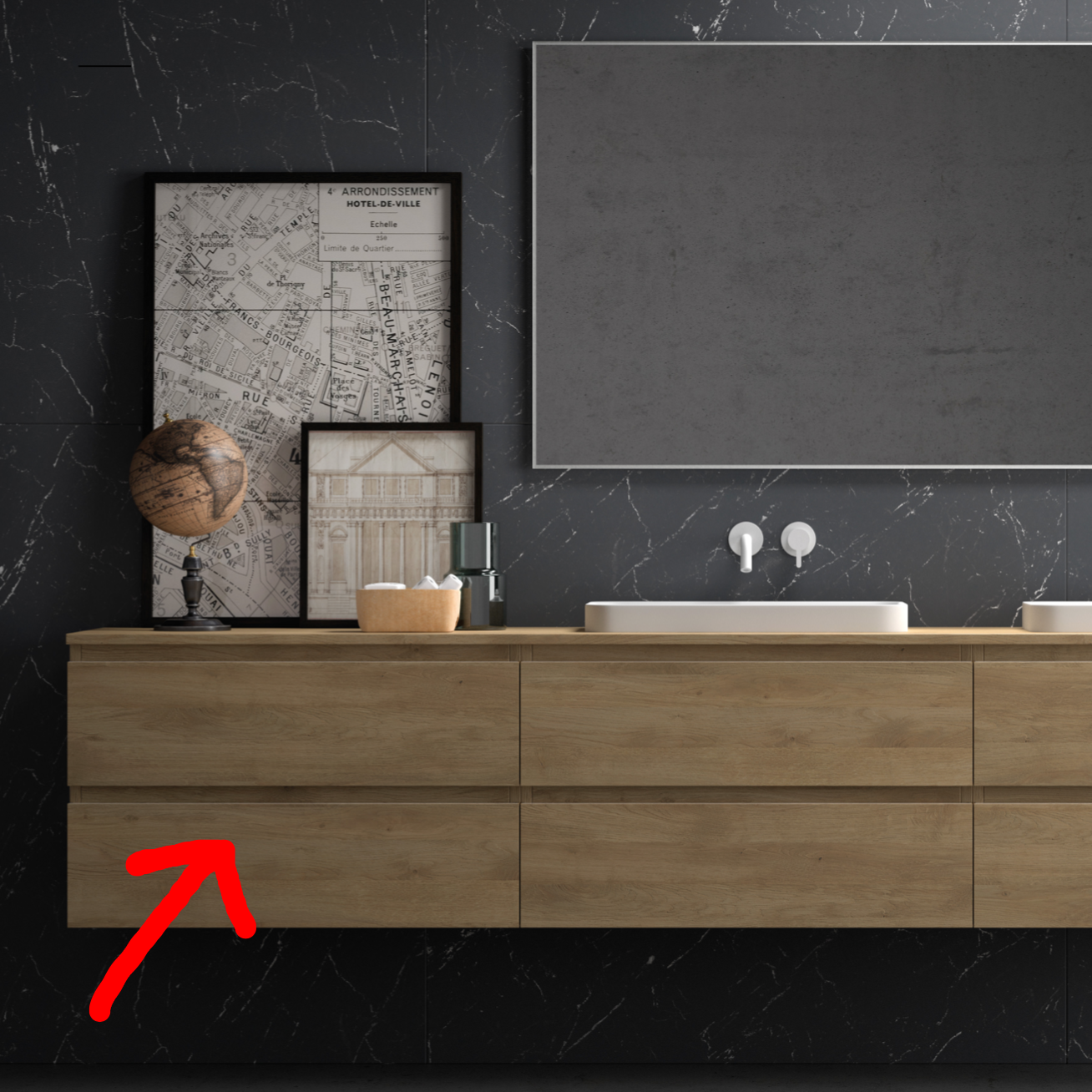 The drawers in the LEO collection feature concealed full-extension runners with soft-close closure. The doors on the tall units and wall units have soft-close hinges.