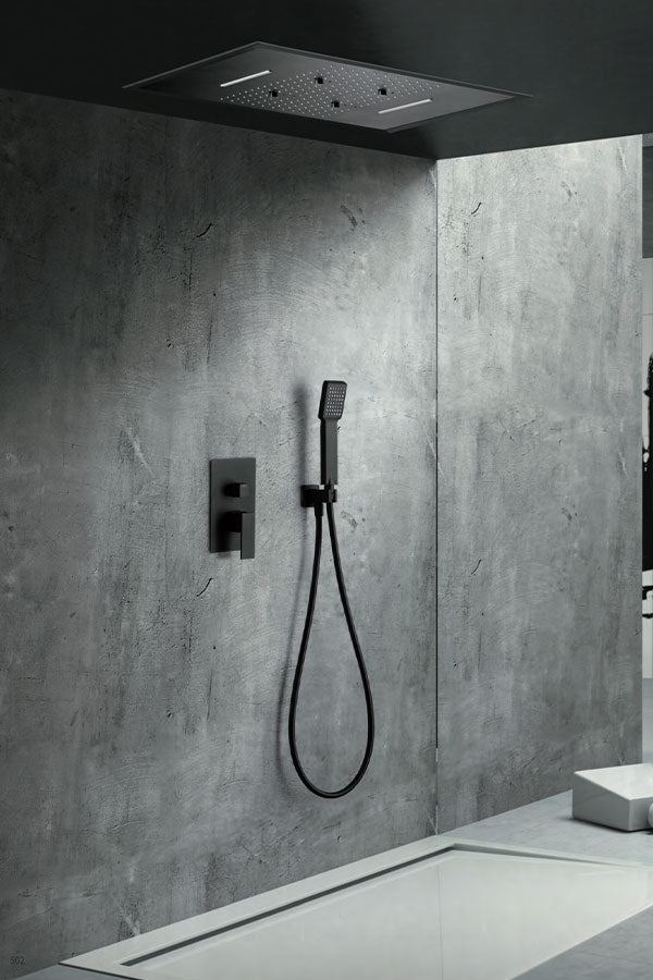 Rociador de acero inox. S304 rectangular 48X59cm, extraplano, negro mate y antical con tres salidas de agua opcionales.