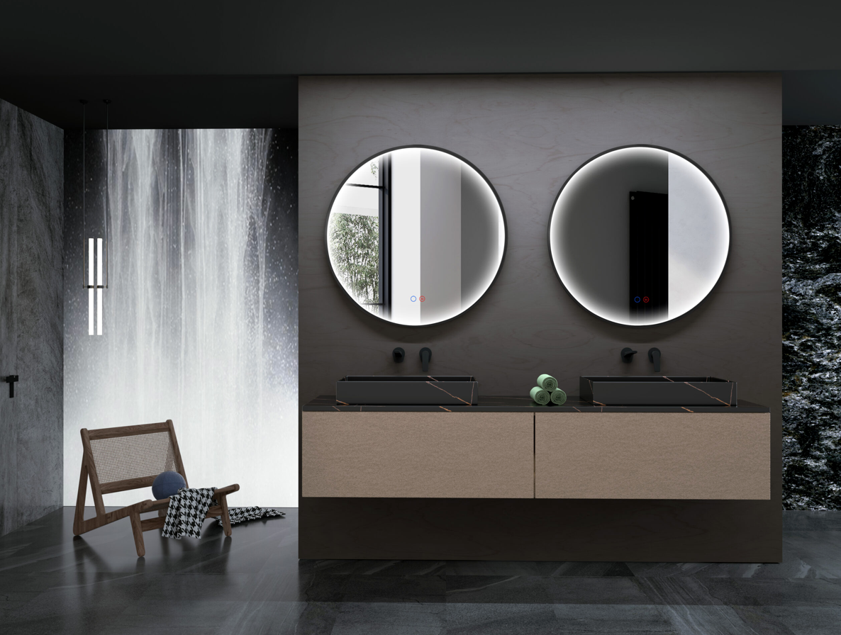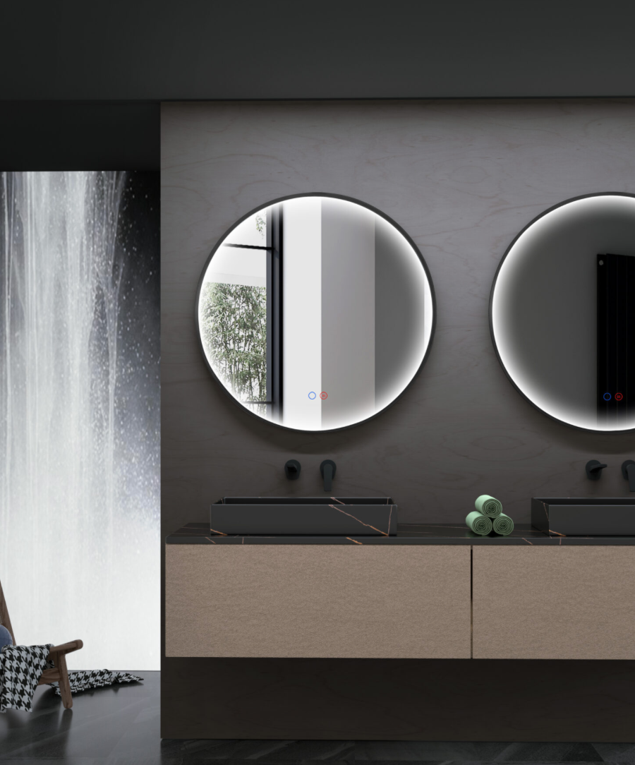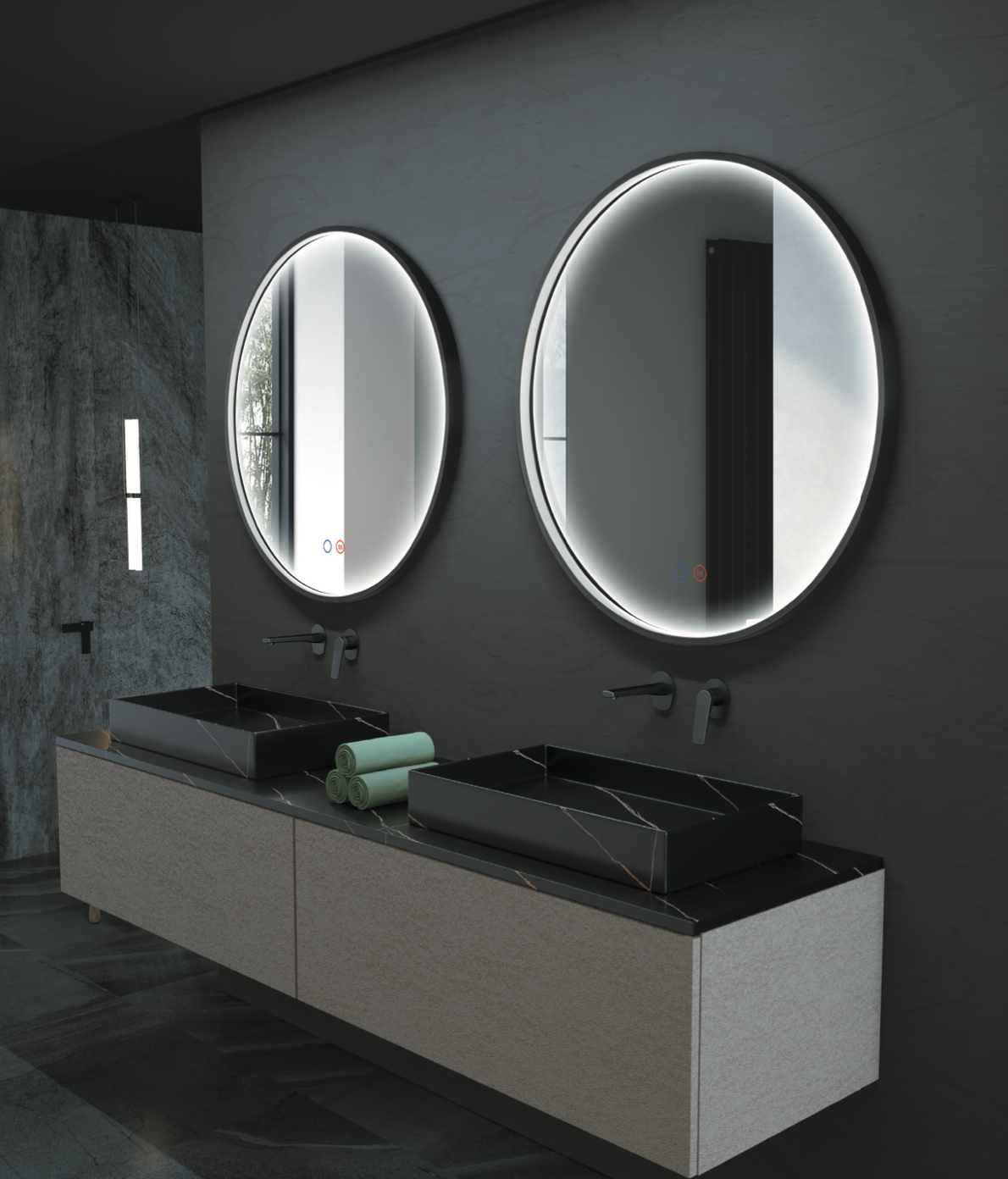 NOUVEAUTÉ! Miroir rond avec éclairage périmétrique intégré dans le cadre en aluminium noir mat qui offre une ambiance décorative. Spécialement conçu pour fournir une réflexion de haute qualité et un excellent éclairage indirect qui ne distrait pas les yeux. Il comprend un double capteur marche/arrêt et antibuée.