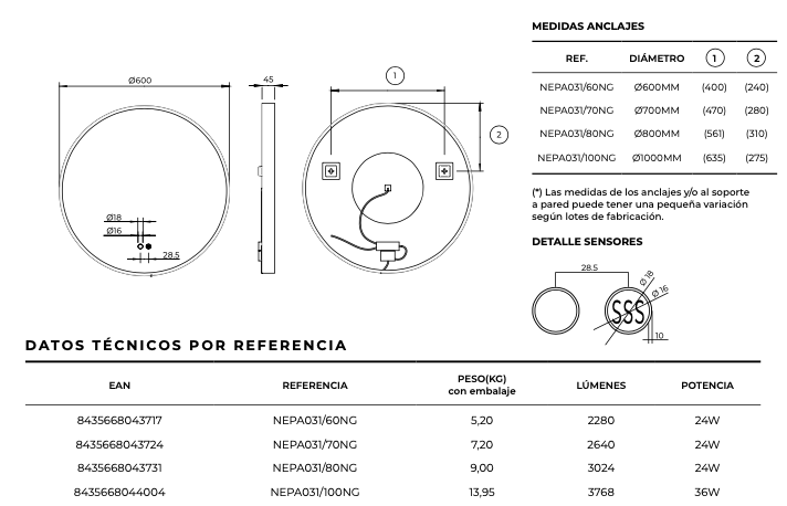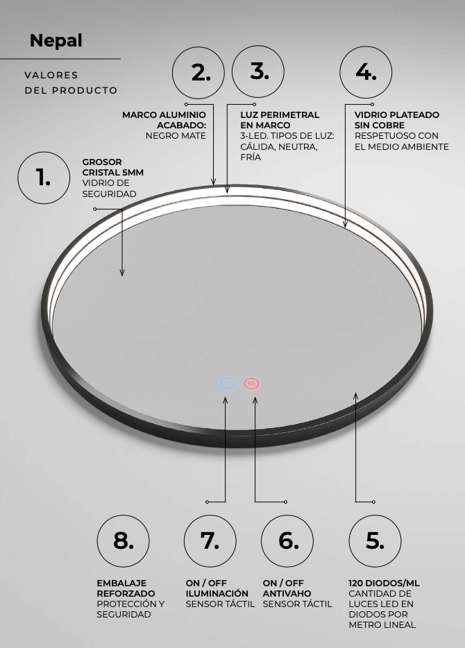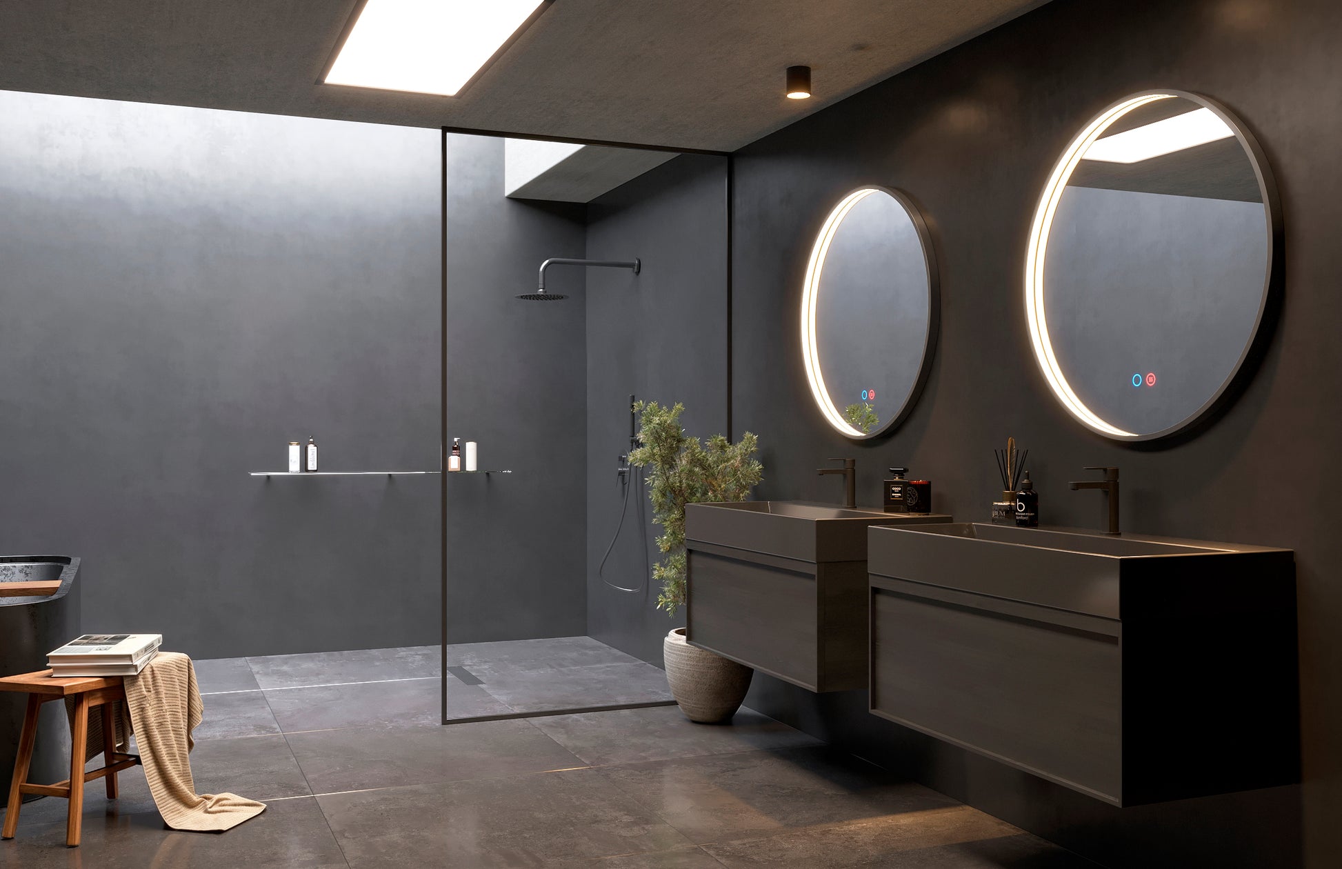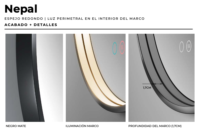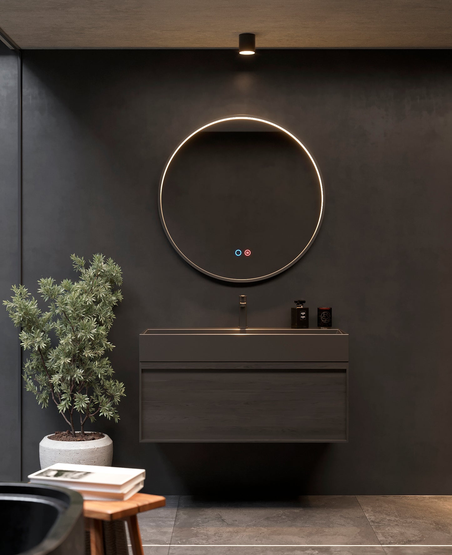 NOUVEAUTÉ! Miroir rond avec éclairage périmétrique intégré dans le cadre en aluminium noir mat qui offre une ambiance décorative. Spécialement conçu pour fournir une réflexion de haute qualité et un excellent éclairage indirect qui ne distrait pas les yeux. Il comprend un double capteur marche/arrêt et antibuée.