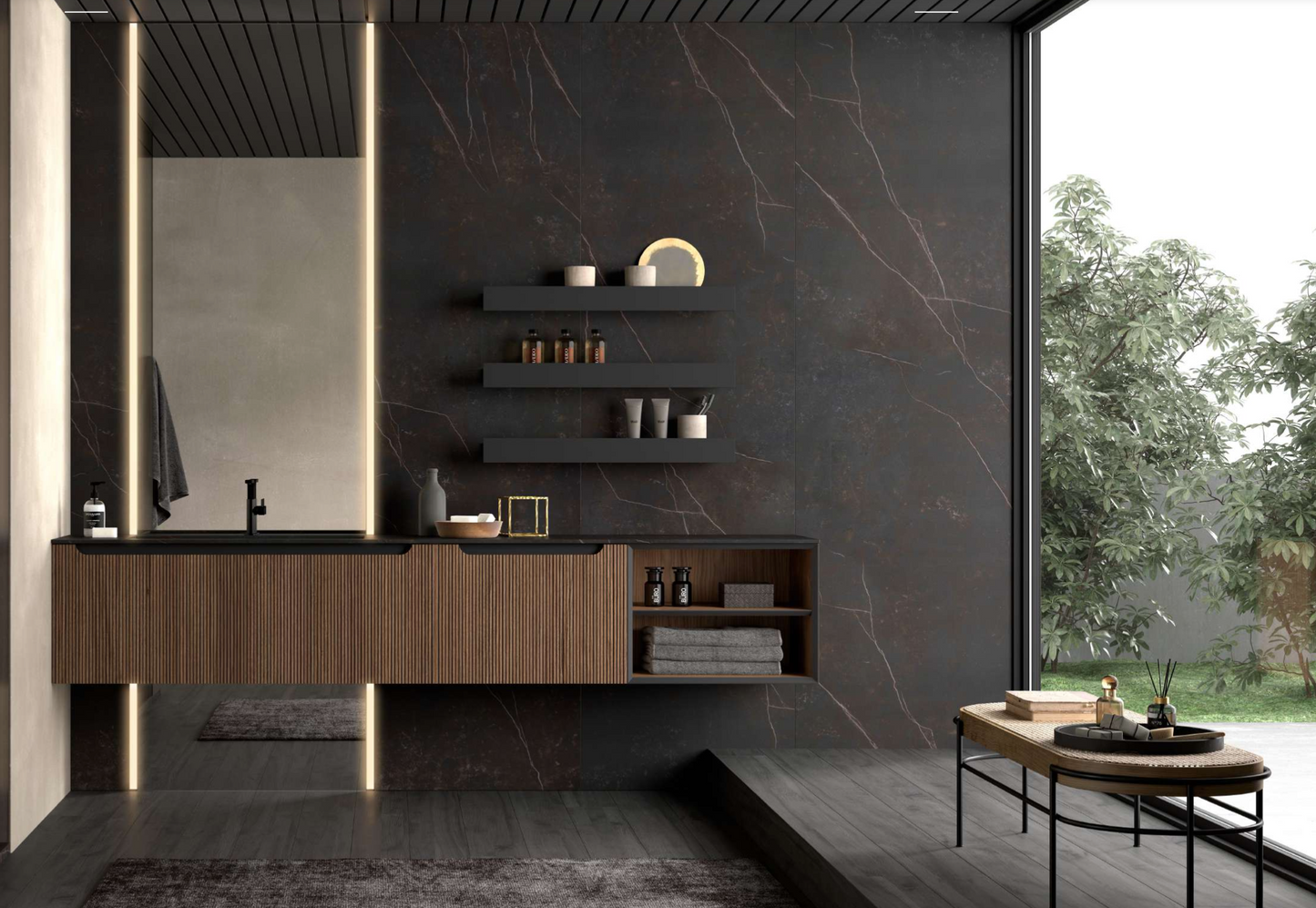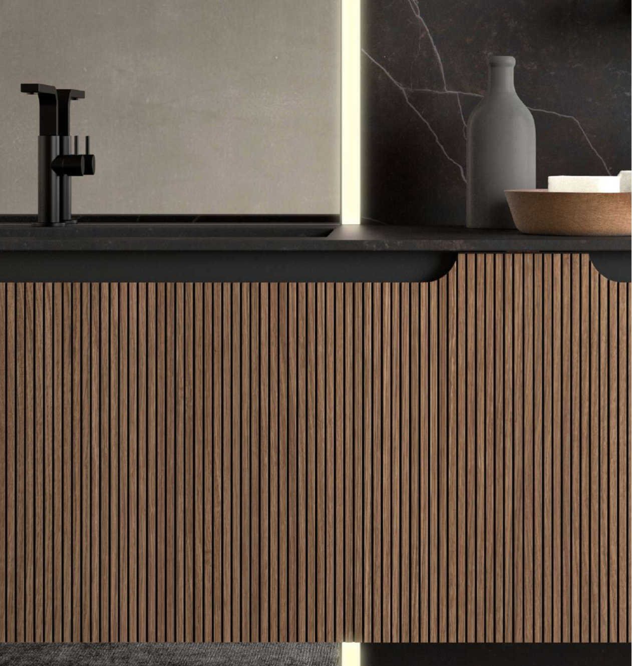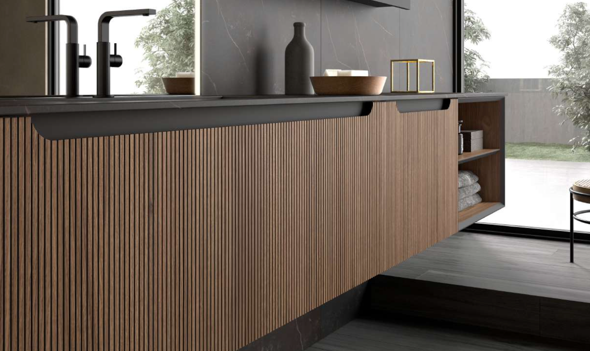 L’esthétique du travail à lattes s’impose avec force dans l’aménagement intérieur et le mobilier.