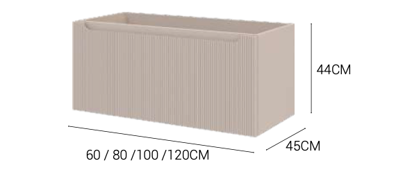 Profondeur 45cm. Hauteur 44cm. Mesures de largeur standard. Finition noyer avec barre avant anthracite. Tiroir en métal anthracite, extraction totale et fermeture amortie. Comprend un distributeur.