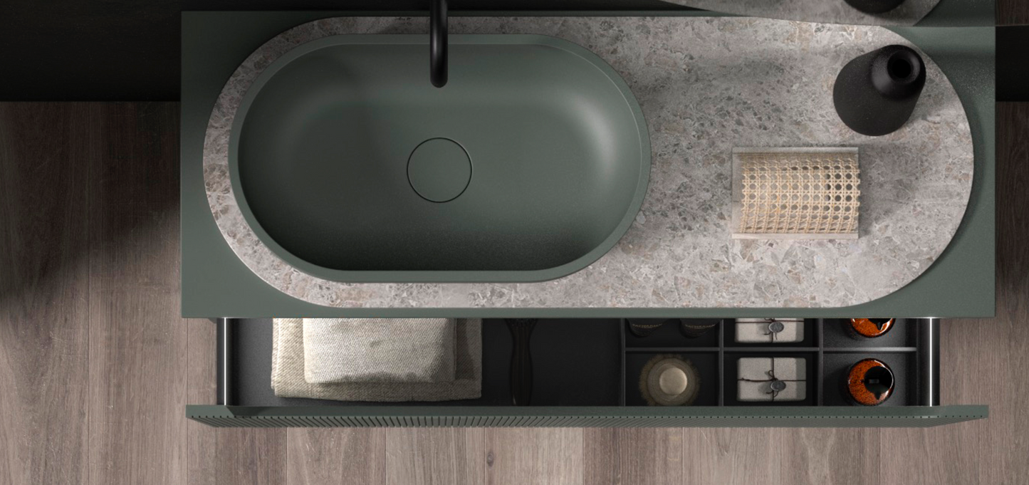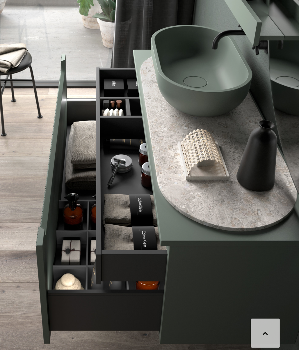 REMARQUE : Le meuble sous-vasque Kimono est livré avec le dessus ouvert. Si vous souhaitez placer un évier à poser, vous devez commander un couvercle supplémentaire. Vous pouvez voir leurs différents prix, mesures et finitions dans notre magasin :