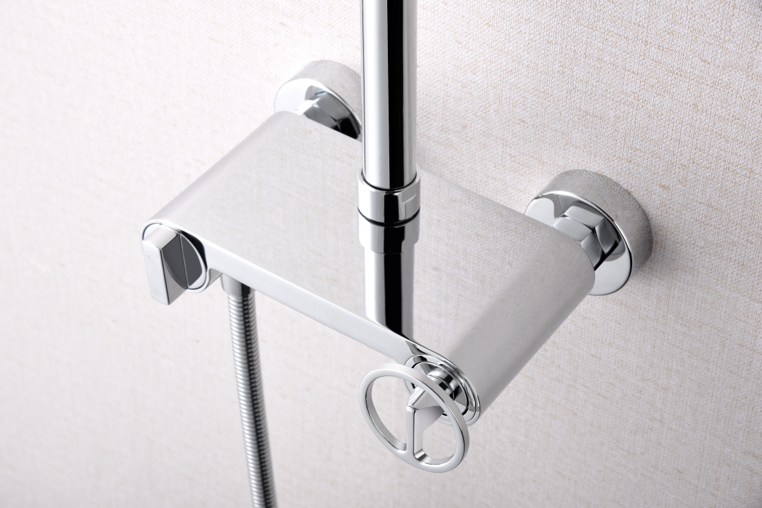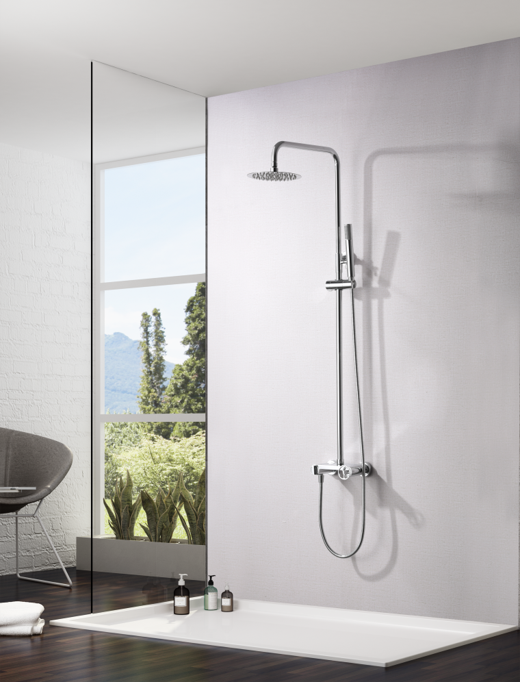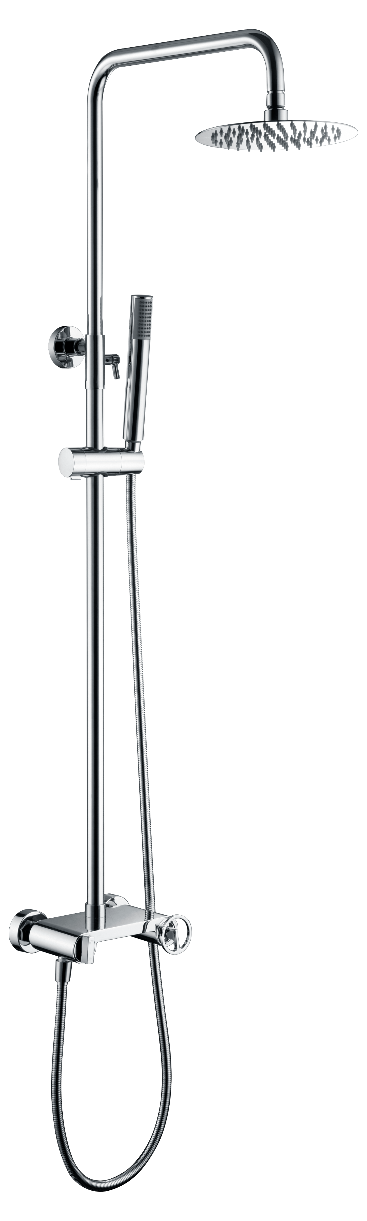 Soporte mango de ducha regulable en altura acabado cromo. Mango de ducha redondo de 1 posición acabado cromo. Grifería monomando de latón acabado cromo con distribuidor incorporado.