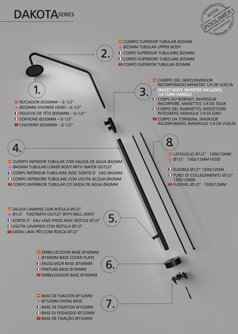 Cuerpo inferior tubular Ø42mm incluye salida de lava-pies con rótula de Ø1/2”.