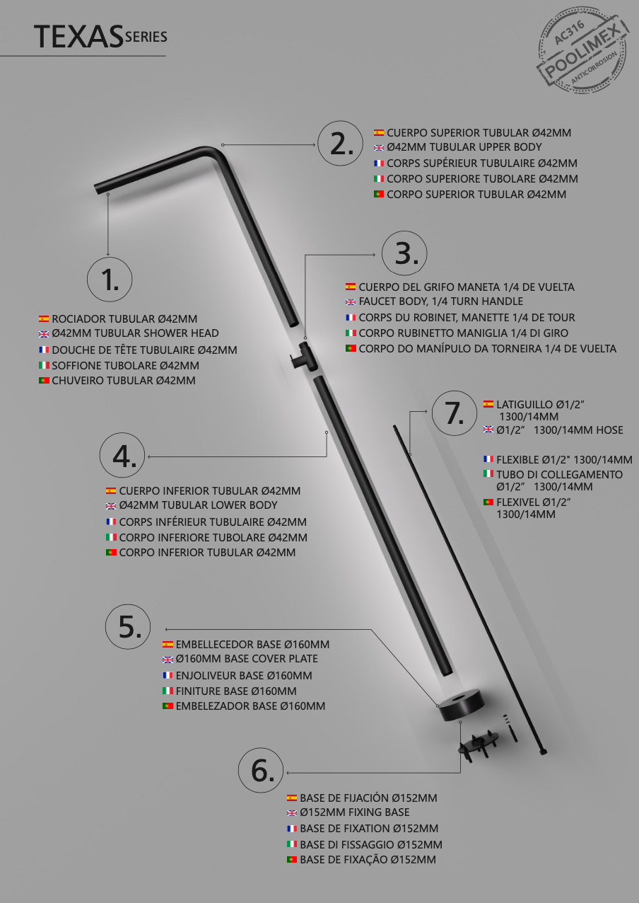 Ducha exterior monofluido inox S.316 negro mate serie Texas de Poolimex