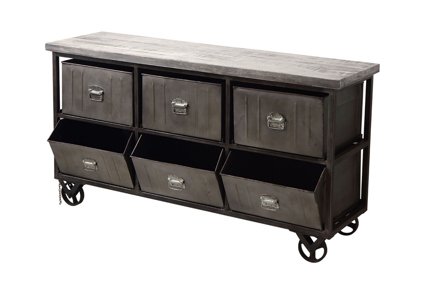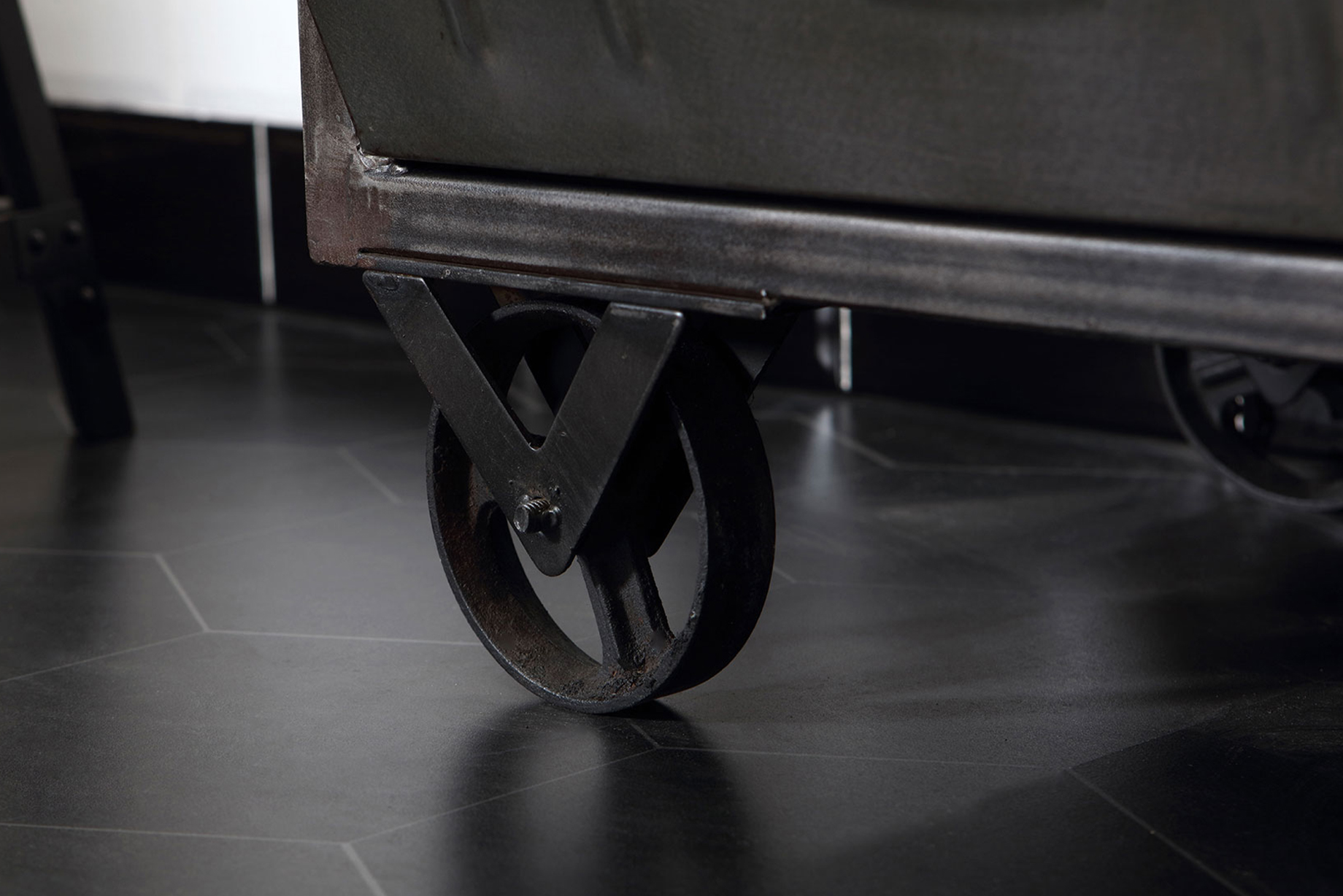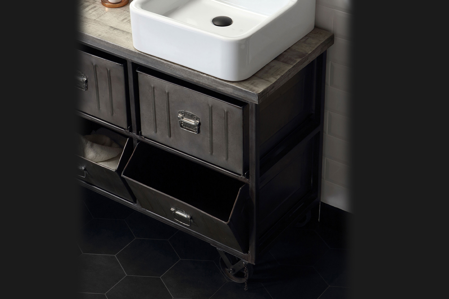Industrialis 2 es un mueble bajo lavabo de madera y metal, con ruedas y 4 cajas metálicas, de estilo Industrial