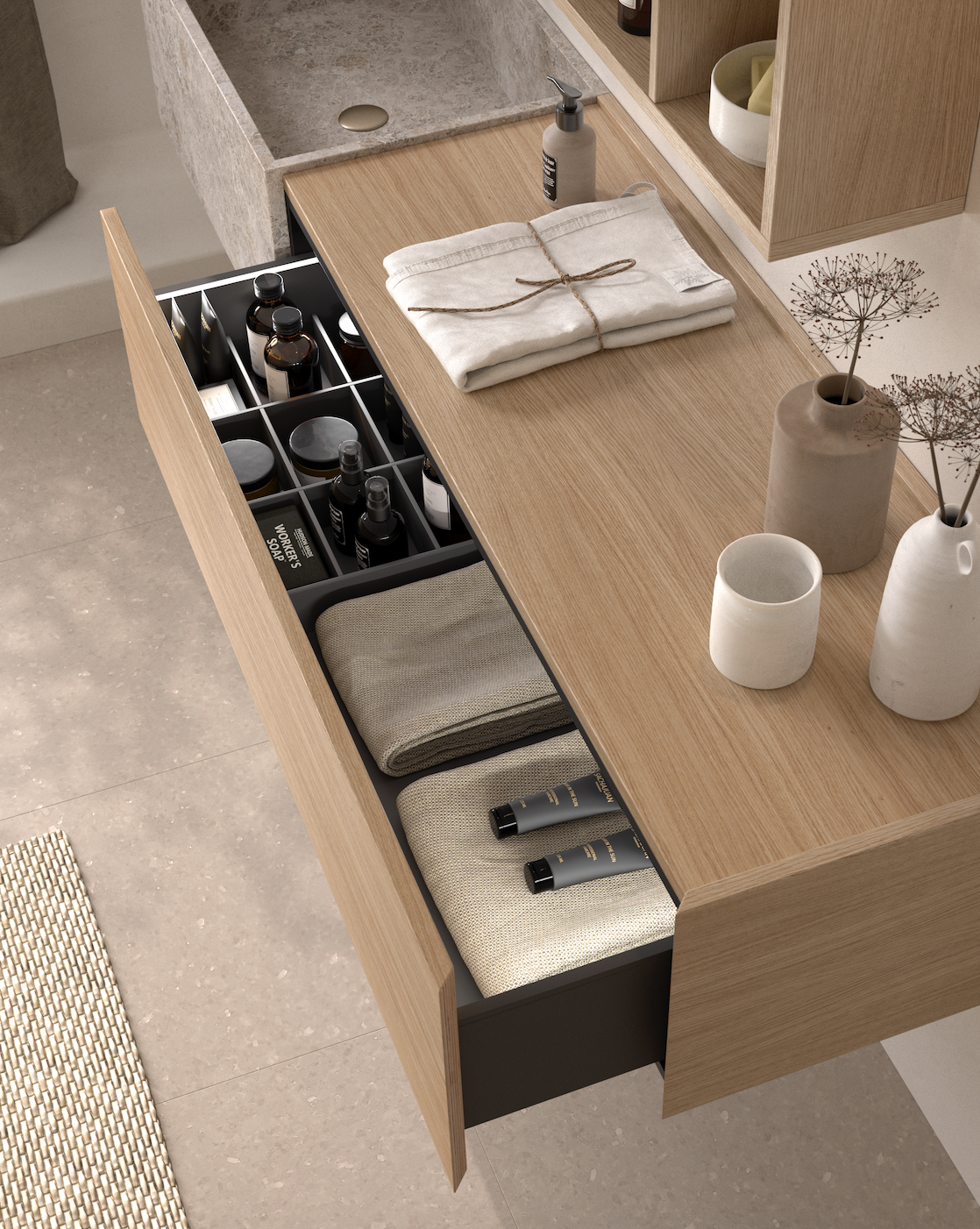 Los cajones de la colección HALTER están realizados con costados metálicos de doble pared provistos de guías de extracción total y cierre amortiguado. En las columnas y muebles altos las puertas tienen bisagras con cierre amortiguado.